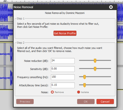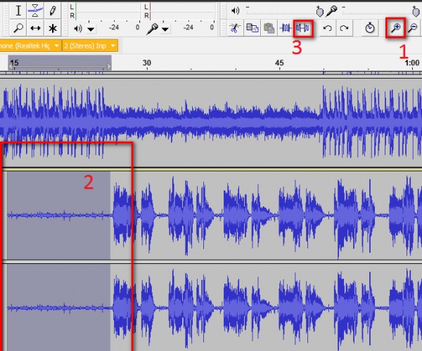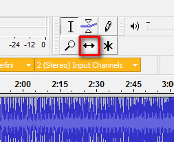 Noise Removal -এ ক্লিক করলে এরকম আসবে, এবার Get Noise Profile-এ ক্লিক করুন। এখন আপনার রেকর্ড করা গানটার উপর ডাবল ক্লিক করুন দেখুন পুরাটা মার্ক হবে এবার আবার Effect থেকে Noise Removal ওপেন করে Ok বাটন চাপুন। লক্ষ্য করে দেখুন অতিরিক্ত শব্দ গুলো অনেক কমে গেছে। কেউ যদি দেখেন অনেক শব্দ রয়ে গেছে তাহলে Ctrl+R চাপুন ফলে আগের Effect আবার অ্যাপ্লাই হবে। যারা মোবাইলে রেকর্ড করেছেন তারা Karaoke 'র মতো গানটা Audacity তে এনে নিচের ছবির মার্ক করা জায়গায় ক্লিক করে নড়িয়ে মিউজিকের সাথে টাইমিং ঠিক করুন।