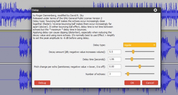 এখন আবার আপনার রেকর্ড করা গানটার উপর ডাবল ক্লিক করুন দেখুন পুরাটা মার্ক হবে এবার Effect থেকে Equalization ওপেন করে নিচে Select Curve: Treble Boost সিলেক্ট করে Ok তে ক্লিক করুন। এখন আবার আপনার রেকর্ড করা গানটার উপর ডাবল ক্লিক করুন দেখুন পুরাটা মার্ক হবে এবার Effect থেকে Delay তে ক্লিক করেন এবং নিচের মতো করে সেটিং দিয়ে Ok তে ক্লিক করুন এবং শুনে দেখুন কি হয়।