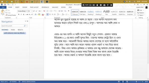 এবার এর অভ্র ভার্সন এ আমি অনেক কিছুই নতুন পেলাম । প্রথমত আমার উইন্ডোজ ৮.১ এর জন্য একটি সুন্দর থিম । তারপর আমার মেট্রো স্ক্রিন এ এখন অভ্র কাজ করে । আরেকটি ফিচার আমার ভালো লেগেছে তা হলো অটমেটিক সুইচ মোড । মানে আমি মনে করেন আমার এমেস ওয়ার্ড এ অভ্র দিয়ে বাংলা লিখছি । কিন্তু এখন আমার ব্রাউজার এ আমার এক বন্ধু আমাকে মেসেজ করেছে । আমি তাকে আবার উত্তর দেওয়ার সময় নিজে নিজে অভ্র বাংলা থেকে ইংরেজি হয়ে যাবে । আবার ওয়ার্ড এ আসলে ইংরেজি থেকে বাংলা হয়ে যাবে ।