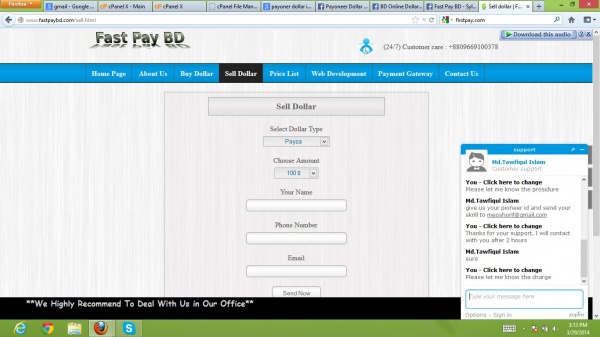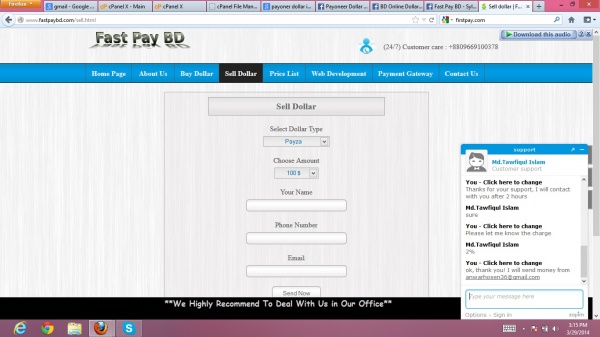 আমার কিছু Skrill ডলার ছিল ডোমেইন কেনার জন্য আমার পেওনার কার্ডে ডলার ট্রান্সফার করতে চা্ইছিলাম । আমার Skrill ভেরিফাইড না তা্ই বাধ্য হয়ে Dollar এক্সচেঞ্জার খুজছিলাম। একটি সাইট পেলাম যারা দাবী করে বাংলাদেশ ব্যাংকের রেজিঃ অনুমোদিত এক্সচেঞ্জার কিন্তু আমার $৫৯ ডলার মেরে দিল।ঘটনাটি হল তাদের লাইভ চ্যাট থেকে একটি ইমেল আইডি ([email protected]) দিয়ে বলা হল Skrill ডলার সেন্ড করতে ও আমার পেওনার আইডি দিতে। আমি Skrill ডলার সেন্ড করার কিছুক্ষনের মধ্যেই তাদের লাইভ চ্যাট হাওয়া হয়ে গেল। তাদের নম্বরে ফোন দিলাম বলল নেটওর্য়াকের জন্য বন্দ হয়ে গেছে।কিছুক্ষন পর ফোন দিলাম বলে ডলার না পাঠালে কি করবি ও আজেবাজে গালিগালাজ ।