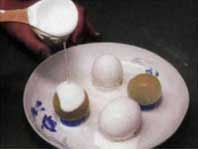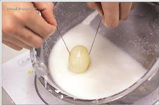 এরপর তরল ক্যলসিয়াম কার্বনেট দ্রবনে ডুবিয়ে ডিমের সাদা আকৃতি প্রদান করা হয়।