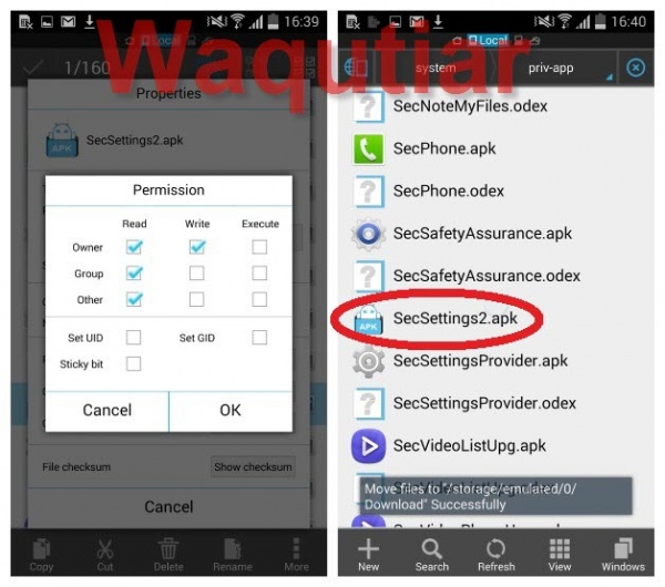 Es File Explorer File Managerটি ওপেন করুন এখান থেকে ঐ APK File টি System/priv-app folder এ কপি করুন । কপি হলে এবার এটাকে রিনেম করুন SecSettings2.apk তে । এবার পারমিশান গুলো পালটিয়ে নিন নীচের চিত্র এর মত করে ।