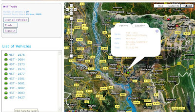 উপরের ছবিতে গাড়ির ছবি দেখা যাচ্ছে। সবুজ রংয়ের গাড়ি গুলো চলন্ত অবস্থায় আছে। মেসেজ এ গাড়িটির বর্তমান গতি এবং পাশের ট্যাবে লোকেশন দেখা যাচ্ছে। জিনিসগুলো আসলে ছবি আকারে দেখা যায় এবং প্রতি মিনিটে একবার রিফ্রেশ হয়। ভবিষ্যতে হয়তো বাইরের দেশের নেভিগেশনের মতো লাইভ ভিডিও আকারে দেখা যাবে। লাল রংয়ের গাড়িগুলোর ইন্জিন বন্ধ আছে। ছবির বাম দিকে কয়েকটি অপশন দেখা যাচ্ছে। View All Vehicles এ ক্লিক করলে সবগুলো গাড়ি একসাথে দেখা সম্ভব। Tools অপশনটি আরও কাজের। এর মাধ্যমে অনেকগুলো রিপোর্ট পাওয়া যায় যা আটোমেটিক ফ্লিট রিপোর্ট তৈরি করে।