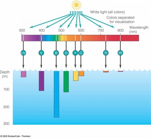 ”সমুদ্রের পানিতে আলো প্রবেশ করার পর তা তার অঙ্গীভূত সাত বর্ণে বিভক্ত হয়। সমুদ্র বিজ্ঞানীরা সম্প্রতি এ কথা প্রতিষ্ঠা করেছেন যে, সমুদ্রের গভীর অংশ একটি সুনির্দিষ্ট বর্ণ বা নির্দিষ্ট তরঙ্গ দৈর্ঘ্যের আলো শুষে নেয়। তারা সম্প্রতি দেখিয়েছেন, লাল বর্ণই সর্বপ্রথম ৩০ মিটার গভীর পর্যন্ত শোষিত হয়। অন্য কথায়, যদি কোনো ডুবুরী আঘাতপ্রাপ্ত হয় এবং এই গভীরতার মধ্যে তার শরীর থেকে রক্ত বের হয় সে তা দেখতে পায় না।