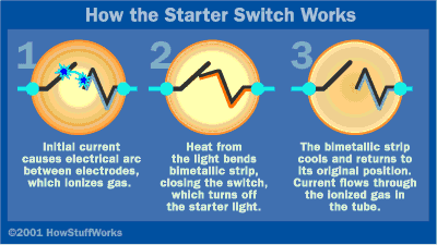 যখন টিউবলাইটটি জ্বালানো হয় তখন বিদ্যুৎ ইলেক্ট্রোড হয়ে ফিলামেন্টগুলোকে উত্তপ্ত করে,যার ফলে ইলেক্ট্রন মুক্ত হয়ে গ্যাসকে আয়োনিত করে। ঠিক এই সময়েই স্টার্টার এর ভিতরেও একধরণের বৈদ্যুতিক স্ফুলিঙ্গ তৈরি হয়। স্টার্টার সুইচ একধরনের ফাপা বাল্ব যার ভিতরে নিয়ন বা অন্য কোন গ্যাস থাকে। এর উপরে দুই প্রান্তে দুটি ইলেক্ট্রোড থাকে। এই ইলেক্ট্রোড গুলোর একপ্রান্ত থেকে আরেকপ্রান্তে বৈদ্যুতিক স্ফুলিঙ্গ তৈরি হয়ে ইলেক্ট্রন প্রবাহিত হবার চেষ্টা করে। ইলেক্ট্রোডগুলোর একটি বিশেষধরণের সংকর ধাতুর তৈরি হয় যা অতিরিক্ত তাপে বাঁকা হয়ে অপর ইলক্ট্রোডকে স্পর্শ করে,যার ফলে বিদ্যুৎ টিউবের ফিলামেন্টের ভিতর দিয়ে না গিয়ে স্টার্টার এর কম রোধযুক্ত সর্ট সার্কিট দিয়ে চলে যায়। আবার ঠান্ডা হয়ে গেলে ইলেক্ট্রোড পূর্বের জায়গায় চলে যায়।