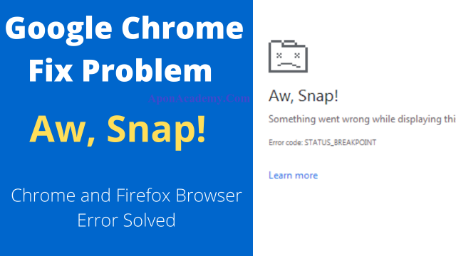 আমার যারা কম্পিউটার ও মোবাইল ব্যবহার করে থাকি। ইন্টারনেট তো ব্যবহার অবশ্যই করি। ইন্টারনেট ব্রাউসিং এর জন্য ব্রাউসার হিসাবে গুগল ক্রোম অথবা মজিলা ফায়ারফক্স ব্রাউসার ব্যবহার করি। ইন্টারনের ব্রাউসিং এর জন্য অনেক সময় ব্রাউসার Crash/ Error / Fix প্রব্লেম হয়ে থাকে। ইন্টারনেট ব্রাউসিং করতে পারিনা। অনেক গুলো ব্রাউসিং প্রব্লেম এর মধ্যে Aw Snap! একটা প্রব্লেম। এটা কিভাবে Solved করা যায় তাই আজ শিখবো, তো চলুন।