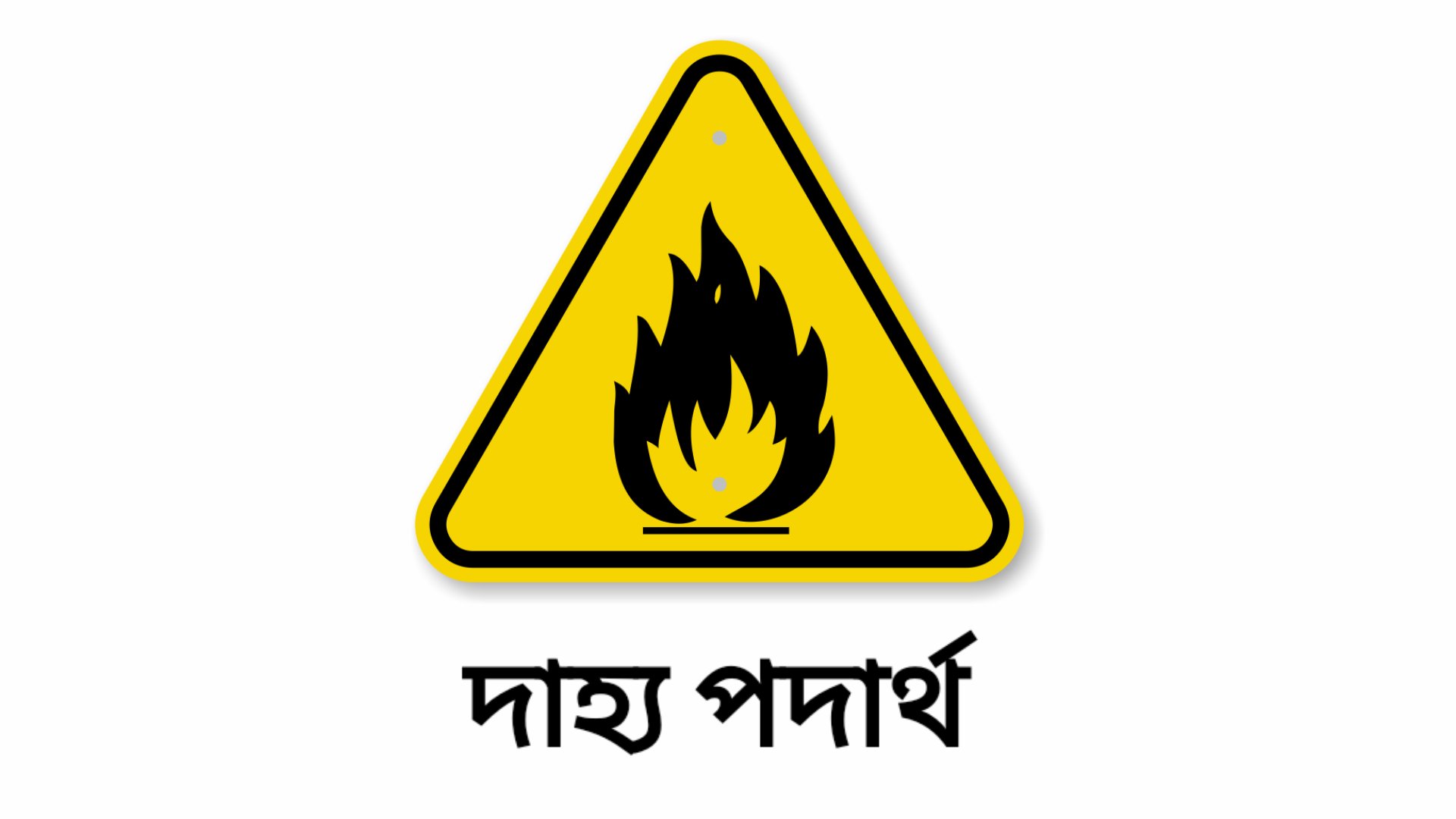 এ ধরনের চিহ্ন কোনো পাত্রের উপর দেখলে বুঝতে হবে এগুলো দাহ্য রাসায়নিক পদার্থ। সহজেই আগুন ধরতে পারে। যেমনঃ পেট্রলিয়াম আগুন এবং ঘর্ষণ থেকে দূরে রাখতে হবে।