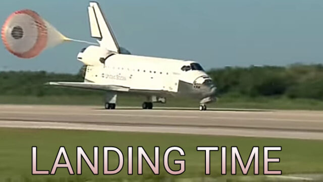 প্রথমে স্পেসক্রাফটটি পৃথিবীকে কেন্দ্র করে গোল হয়ে ঘুরতে থাকে। এভাবে ঘুরতে ঘুরতে স্পেসক্রাফটটি পৃথিবীর বায়ুমণ্ডলে প্রবেশ করে। বায়ুমণ্ডলে উড়ার সময় স্পেসক্রাফটটি পৃথিবীর সমান্তরালে না থেকে এর মাথা সামান্য উচু হয়ে থাকে। এর কারণ হলো স্পেসক্রাফট প্রচন্ড গতিবেগে উড়ে। এই গতিবেগে ভূমির সমান্তরাল হয়ে উড়লে এটি বাতাসের সংঘর্ষে পুড়ে ছাই হয়ে যাবে। এটি যত নিচে নামতে থাকে তত ভূমির সাথে সমান্তরাল হতে থাকে। একসময় এটি একটি এয়ারপোর্টে ল্যান্ড করে।