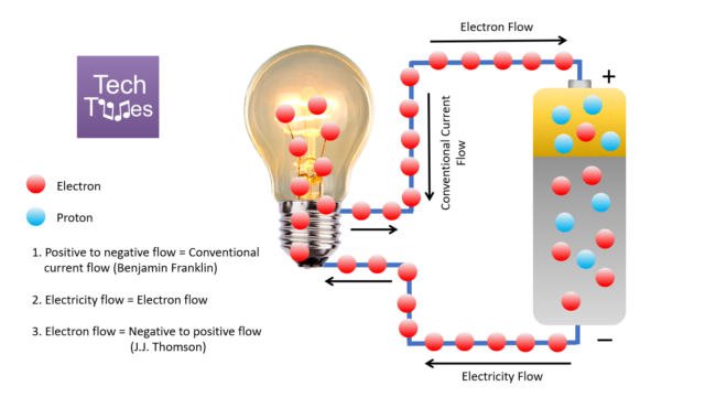 ইলেক্ট্রনের ঘাটতি হলো উচ্চ বিভব এবং ইলেক্ট্রনের আধিক্য হলো নিন্ম বিভব। বিদ্যুৎ নিন্ম বিভব থেকে উচ্চ বিভবের দিকে প্রবাহিত হয় বা সোজা কথায় বিদ্যুৎ যেদিকে ইলেক্ট্রন বেশি সেদিক থেকে যেদিকে ইলেক্ট্রন কম সেদিকে প্রবাহিত হয়। মানলাম ইলেক্ট্রন প্রবাহই হলো বিদ্যুৎ প্রবাহ। তাহলে কেনো বলা হলো যে, ইলেক্ট্রন প্রবাহের বীপরিতে বিদ্যুৎ প্রবাহীত হয়? এই ধারনার মূল উৎস জানতে হলে আমাদেরকে একটু পেছনের দিকে যেতে হবে।