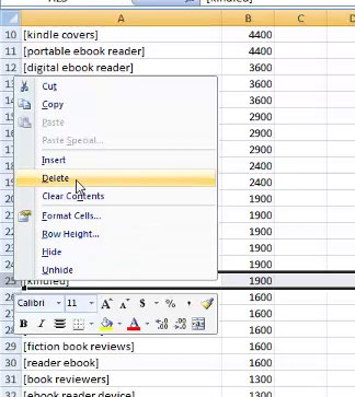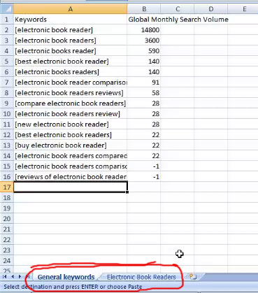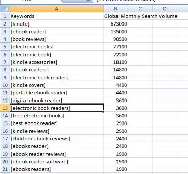 এখন আমাদের কাজ হবে, যে sheet টা আমরা সেভ করছি ঐটা open করা এবং এখান কিছু highly related keyword select করা এবং phrase গুলো যেন বিভিন্ন category তে ভাগ করা যায়। এখন ধরুন আমরা 'electronic book reader' phrase টা নির্বাচন করলাম যা আমাদের ওয়েবসাইটের বিষয়ের সাথে highly related.