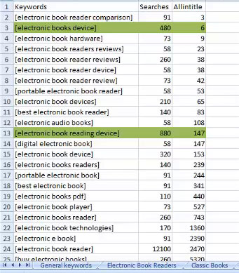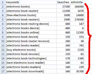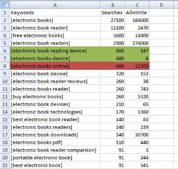 লক্ষ করুন এই শীটে কিছু keyword আছে যাদের searches কম এবং allintitle অনেক বেশী। আমাদের এই keyword গুলো অবশ্যই বাদ দিতে হবে। আমরা এই ধরনের কিওয়ার্ড গুলো red color করে রাখব। যেমন: দেখুন 'electornic books online' এই কিওয়ার্ড এর সার্চ মাত্র ৪৮০ তার বিপরীতে প্রতিযোগী ১২৩০০. এই keyword এর জন্য compete করা হবে বোকামী। সাধারণত এই ধরনের ঘটনা ঘটে যখন কেউ Keyword Research না করেই কোন Keyword optimize করা শুরু করে। এই কারণেই কিওয়ার্ড রিসার্চ খুবই গুরুত্বপূর্ণ, নাহলে আপনার সময় ও শ্রম দুটোই অপচয় হবে। তাই কিওয়ার্ড রিসার্চ এর জন্য সমস্যা হলেও, একটু সময় বের করুন এবং সঠিকভাবে এটা করুন। তাহলে, ultimately আপনারই লাভ হবে।