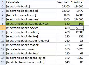 তারপরে 'electronic books device' এই keyword টা দেখুন তুলনামূলক আরো ভাল কারন ৪৮০টা সার্চ এর বিপরীতে allintitle মাত্র ৬টা। এভাবে প্রয়োজনীয় কিওয়ার্ডগুলো বের করুন এবং excel এর cell এর color green করুন অথবা আপনার পছন্দমত অন্য কালারও করতে পারেন। এভাবে ধীরে ধীরে অন্য কিওয়ার্ডগুলো বাছাই করুন এবং সবুজ রঙ এর মাধ্যমে হাইলাইট করুন।