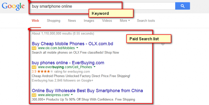 Pic 1 এ আমরা দেখতে পাচ্ছি আমাদের একটি কীওয়ার্ড Buy smartphone online লিখে সার্চ ইঞ্জিন এ সার্চ করায় ঠিক নিচে পেইড রেজাল্ট শো করছে। Paid SEO তে প্রতি ভিজিটরের জন্য টাকা গুনতে হবে।