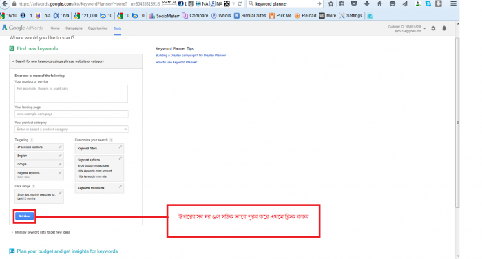 ১.প্রথমে আপনার ইমেইল অ্যাকাউন্ট দিয়ে Google Webmaster tool এ লগইন করুন।তারপর Google এ Keyword planner লিখে সার্চ দিন। সার্চ রেজাল্টের প্রথমের সাইটটিতে প্রবেশ করুন। অথবা Google Adwords থেকে Tools and analysis > Keyword Tools মাধ্যমেও আপনার Keyword planner টুলতি ওপেন করতে পারবেন। Keyword planner এর ইন্টারফেচ নিম্নরুপ।