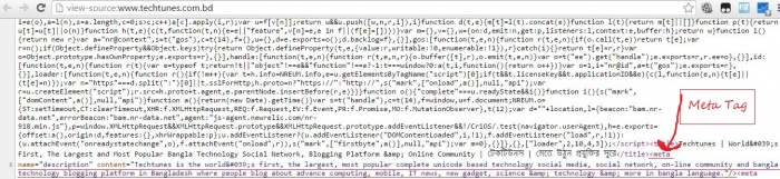 মেটা ট্যাগ: আপনি গুগলে যেকোন কিছু লিখে সার্চ দিলে দেখতে পাবেন প্রতিটি সার্চ রেজাল্টের নিচে ২-৩ লাইনে কিছু কথা বার্তা লেখা থাকে। এই কথা বার্তা গুলা গুগল পাইল কই? আপনি কি ভাবছেন গুগল নিজেই এগুলা লিখে দিছে? না ভাই, গুগলের এত টাইম নাই! এগুলা ঐসব ওয়েবসাইটের HTML কোডের মধ্যে Meta Tag এর মাধ্যমে লেখা আছে। গুগল জাস্ট ঐ লেখাগুলাকেই আপনার সামনে প্রদর্শন করতেছে! নিচের ছবি দুইটা দেখলে আরো ক্লিয়ার কাট আইডিয়া পাবেন: