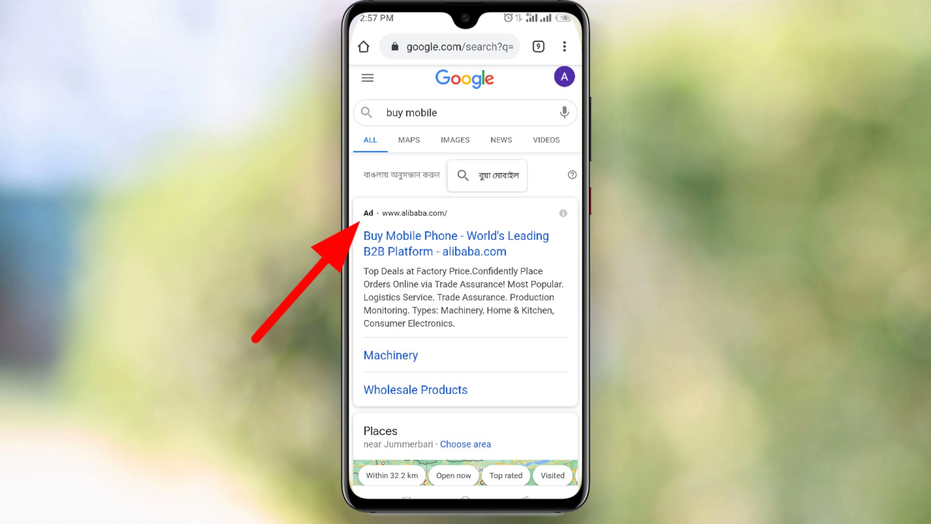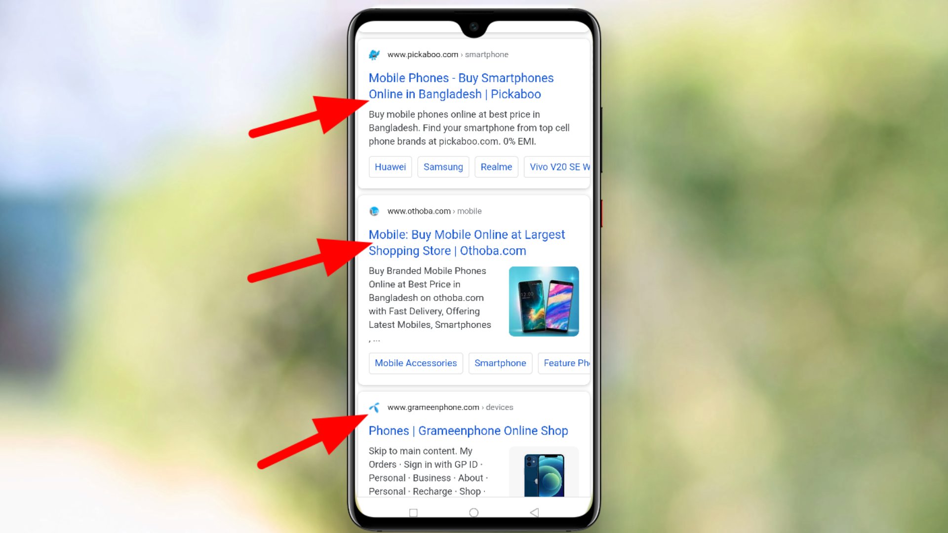 আমি এখানে buy mobile লিখে গুগলে সার্চ করেছিলাম। এখানে ওয়েবসাইটটির প্রথমে দেখতে পাচ্ছেন ছোট করে ad লেখা। অর্থাৎ এ ওয়েবসাইটটি buy mobile কীওয়ার্ডের উপর ট্রাফিক নেওয়ার জন্য গুগলকে টাকা দিচ্ছে। সেজন্য এটি সার্চ ইঞ্জিনের প্রথমে দেখাচ্ছে। এই এড ইম্প্রেশন এবং প্রতি ক্লিকের জন্য সেই ওয়েবসাইটকে নিদিষ্ট অংকের একটি অ্যামাউন্ট দিতে হচ্ছে সার্চ ইঞ্জিনকে।