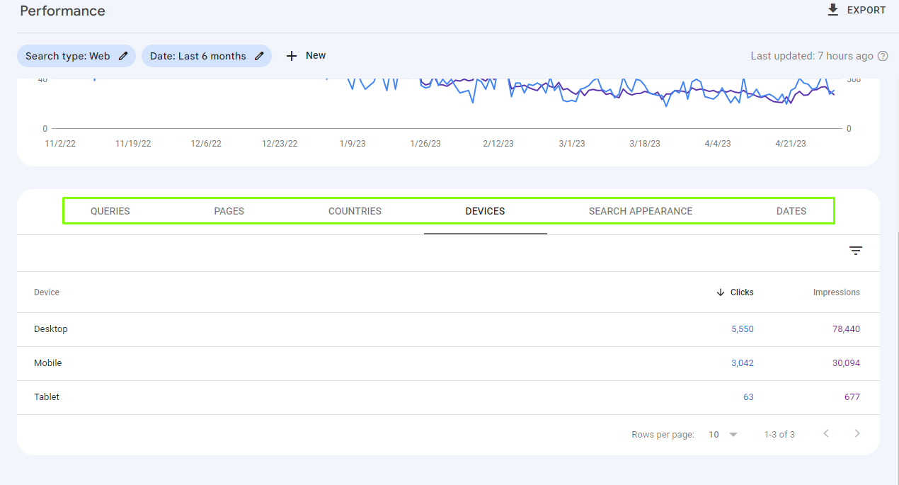 Dates: Clicks এবং impressions গুলো ডেট অনুযায়ী দেখা যাবে। চাইলে Descending অথবা Ascending অর্ডারে সাঝানো যাবে।