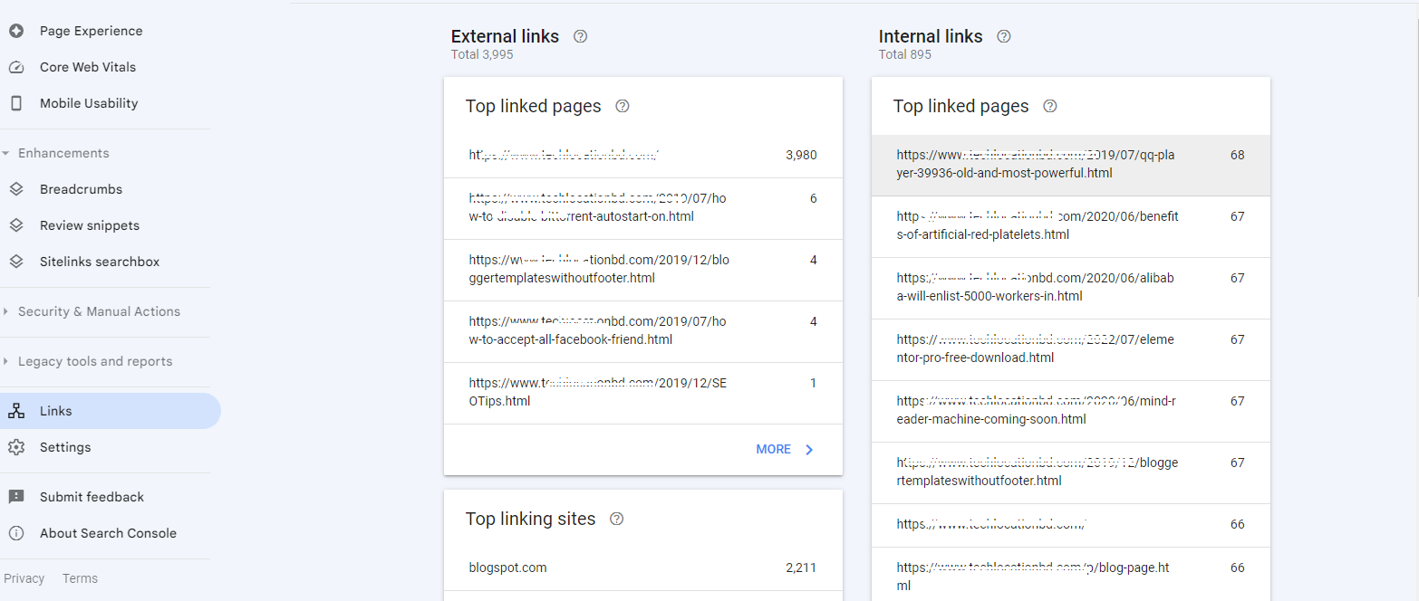 Search Console এর মাধ্যমে আপনি আপনার ওয়েবসাইটের সাথে যুক্ত সকল লিংক দেখতে পারবেন। এখানে বলে রাখা ভাল, এই সেকশনে এটা জানা যায় না যে কোন লিংক গুলোর কারণে র্যাংকিং ভাল হচ্ছে। এটাতে শুধু মাত্র লিংক করা URL গুলোর রিপোর্ট পাওয়া যায়।