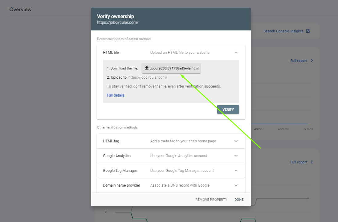 গুগল ডোমেইনে রেজিস্টার করা ডোমেইন গুলো অটোমেটিক্যালি ভেরিফাই করে নেয়া যাবে। তবে এর বাইরে ওয়েবসাইট ভেরিফাই এর জন্য আছে, HTML ফাইল আপলোড, Meta tag, Google Analytics ট্র্যাকিং কোড, এবং Google Tag Manager।