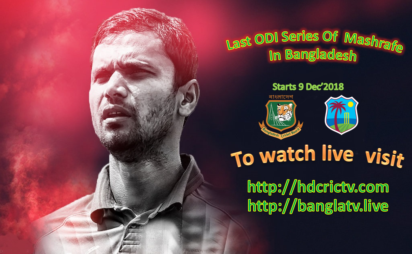 বাংলাদেশ বনাম ওয়েস্ট ইন্ডিজের মধ্যেকার ওয়ানডে সিরিজ মাঠে গড়াবে ৯ই ডিসেম্বর থেকে। বাংলাদেশের হয়ে দেশের মাটিতে শেষবারে জন্য লাল-সবুজের জার্সি পড়ে মাঠে নামছে মাশরাফি বিন মর্তুজা। ক্যাপ্টেন ফ্যান্টাস্টিকের দেশের মাটিতে শেষ ওয়ানডে সিরিজ এর প্রতিটি মুহূর্ত দেখতে ভিজিট করুন এইচডি ক্রিক টিভি লাইভ ও বাংলা টিভি লাইভে।