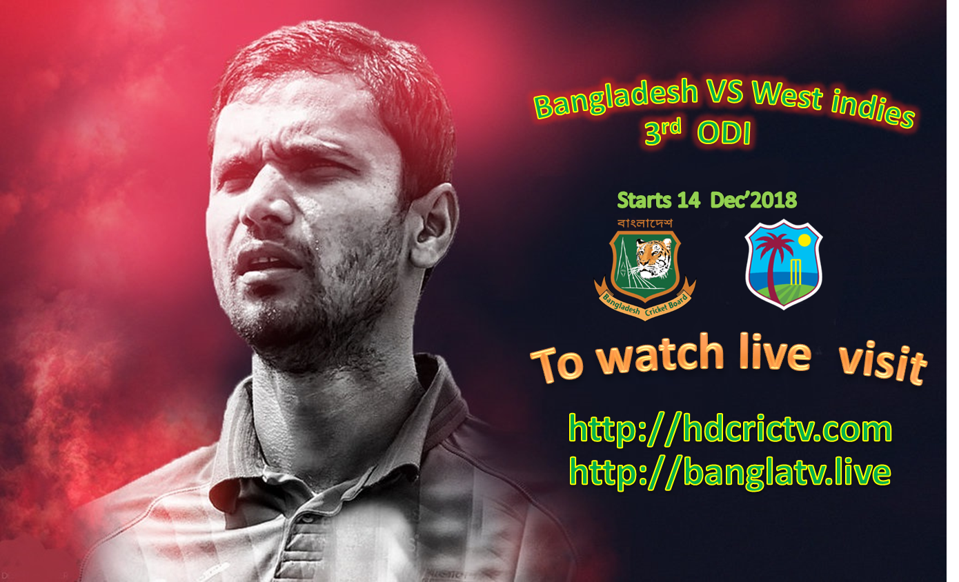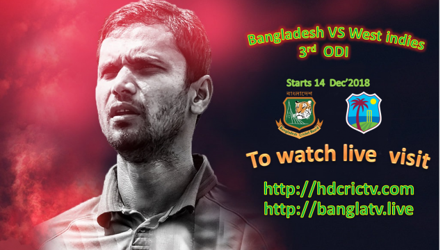 বাংলাদেশ বনাম ওয়েস্ট ইন্ডিজের মধ্যেকার ৩য় ওয়ানডে মাঠে গড়াবে ১৪ ই ডিসেম্বর। বাংলাদেশের হয়ে দেশের মাটিতে শেষবারে জন্য লাল-সবুজের জার্সি পড়ে মাঠে নামছে মাশরাফি বিন মর্তুজা। ক্যাপ্টেন ফ্যান্টাস্টিকের দেশের মাটিতে শেষ ওয়ানডে সিরিজ এর প্রতিটি মুহূর্ত দেখতে ভিজিট করুন এইচডি ক্রিক টিভি লাইভ ও বাংলা টিভি লাইভে।