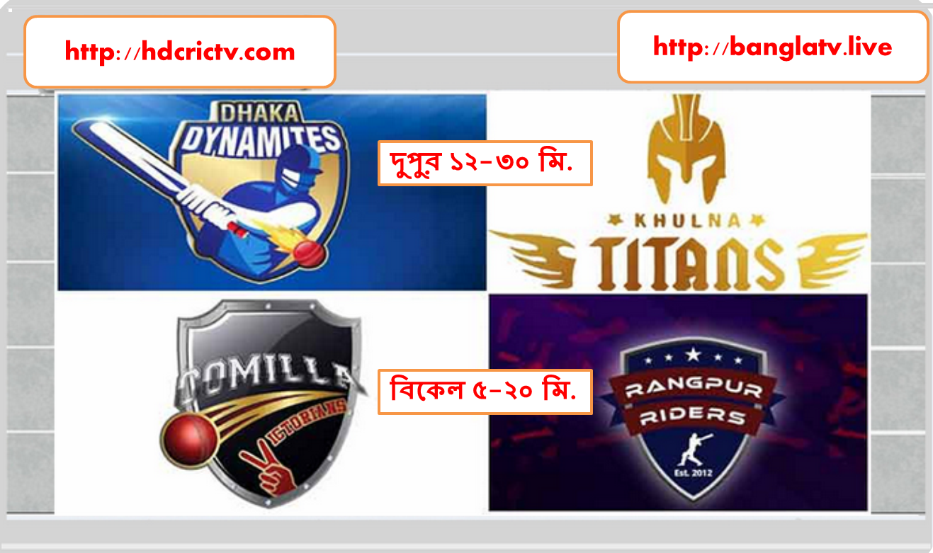 বিপিএল টি-২০ ক্রিকেট টুর্নামেন্টের আজকের খেলা ঢাকা ডায়নামাইটস বনাম খুলনা টাইটান্স (দুপুর ১২-৩০ মি)এবং কুমিল্লা ভিক্টোরিয়ান্স বনাম রংপুর রাইডার্স (বিকেল ৫-২০ মি)