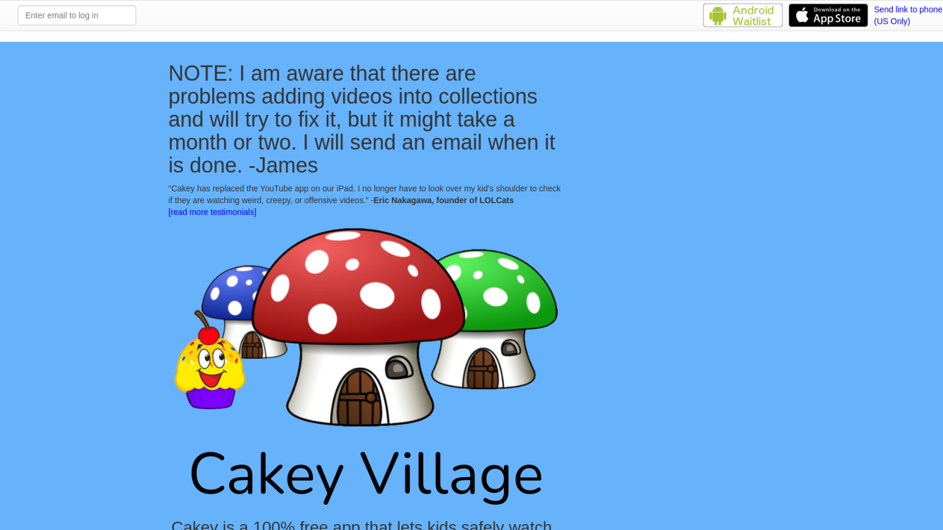 Cakey Village হল YouTube Kids বিকল্প অনলাইন ভিডিও সার্ভিস। এটি মূলত YouTube এর লাইব্রেরি ব্যবহার করে তার কন্টেন্ট সংগ্রহ করে, তবে এর লিমিটেশন এবং অনুমোদিত চ্যানেলগুলোর তালিকা YouTube Kids অ্যাপের মতো সীমাবদ্ধ নয়।
