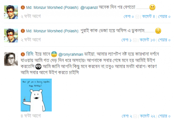 বেশতোর মাইক্রোব্লগে প্রতিদিন আড্ডা জমে বিভিন্ন বিষয় নিয়ে। যেমন- একদিন হয়ত যে যে তাঁর তাঁর মুদ্রাদোষ নিয়ে জোরে সোরে পোস্ট দিয়ে গেল, আবার কার কোন মুভি প্রিয় এমন বিষয়েও আরেকদিন তুমুল মজার তর্ক হয়ে গেল। ইউজাররা নিজেরাও একে অন্যকে ট্যাগ করে আড্ডা দিতে ডাকেন। যে যখন অনলাইনে থাকেন, সাড়া দেন সেই ডাকে। ব্যাস, তারপর কি সময় ক্ষণ খেয়াল থাকে!