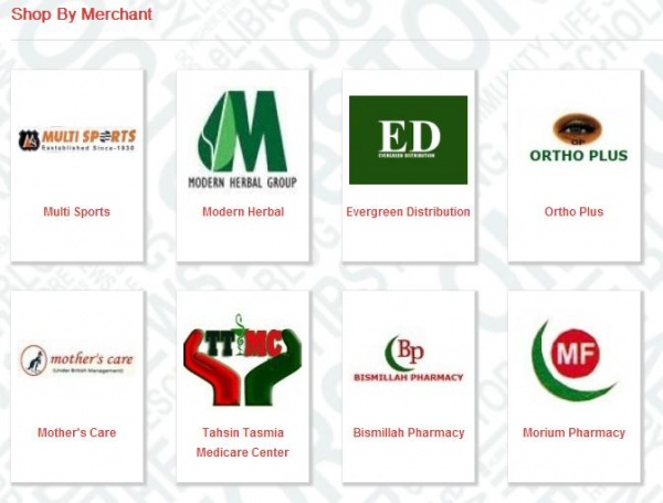e-Store এর নিচের অংশে Shop by merchant শিরোনামে খুজে পাবেন বিভিন্ন কোম্পানীর/ডিসপেনশারীর কার্যকরী ঔষধগুলোর বিবরন, মূল্য এমনকি একই ক্যাটাগরির অন্যান্য ঔষধগুলোর তালিকা ও মূল্য পেয়ে যাবেন খুব সহজেই।