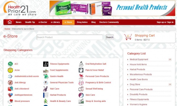 e-Store এর শুরুতেই আপনার দরকারী বিষয়/বস্তুটি খুজে নেয়ার জন্য রয়েছে সার্চ বক্স। এখান থেকে খুব সহজেই আপনার কাঙ্খিত ঔষধটি খুজে পেতে পারেন। পরবর্তী অংশে Shopping categories এর প্রতিটি আইটেমে ক্লিক করে আপনি উক্ত আইটেমের অধীন পন্যগুলো, মূল্য পাবেন। এমনটি প্রতিটি পন্যের উপরে ক্লিক করে এই পন্যটির বিস্তারিত বিবরন এমনকি এই পন্যের সমগোত্রীয় কি কি পন্য রয়েছে সেগুলোর তালিকা দেখতে পারবেন এক নিমিষেই।