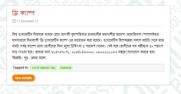 HealthPrior21 News পেজটিতে আপনি পাবেন স্বাস্থ্য সংক্রান্ত সব ধরনের সর্বশেষ সংবাদ। আপনার বাচ্চা শিশুকে পোলিও টিকা খাওয়াতে হবে। সরকারী তারিখ নির্ধারণ করা হয়েছে অথচ আপনি জানেননা। এই পেজটিতে চোখ রাখুন আপনার কোন টেনশানই থাকবেনা। দেশ-বিদেশের এরকম অনেক স্বাস্থ্য সংবাদ যদি আমরা সবসময় ঠিকমত পাই তবে তা কতখানি কাজে লাগবে তা আপনারাই বলুন। যেমন দেখুন চিত্রটি-