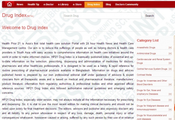 HealthPrior21 Drug Index পেজটিতে আপনি পাবেন ঔষধের সুবিশাল একটি তালিকা যেটি সাজানো হয়েছে বিভিন্ন ক্যাটাগরিতে। ঔষধের গ্রুপ, রোগের গ্রুপ, অঙ্গ-প্রতঙ্গের গ্রুপ করে এমনভাবে সাজানো হয়েছে যে খুব সহজেই আপনি খুজে পাবেন কোন ঔষধটি আপনার প্রয়োজন। ঔষধটি খুজে নেবার পর আপনি পাবেন ঔষধটির বিবরন, খাওয়ার নিয়মকানুন, মূল্য। তাই কোন রোগে হঠাৎ আক্রান্ত হয়ে গেলেও ভুল ঔষধ খাওয়ার, মাত্রাতিরিক্ত ঔষধ সেবনের সম্ভাবনা থাকছেনা একদমই।