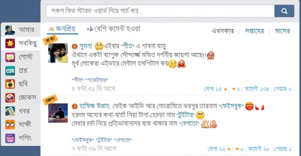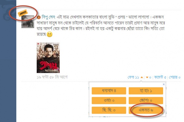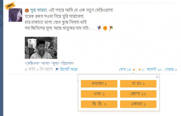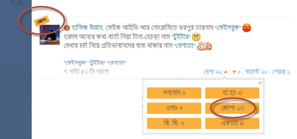 কারো পোস্ট কে আপনি 'বেশ' হিসেবে ভোট করতে পারবেন 'জোশ!', 'একমত', 'হাহা!', 'ধন্যবাদ', 'ওমা!' অথবা 'ছিঃ ছিঃ' দিয়ে! আরো পারবেন 'অতটা ভাল না' ভোট দিতে।