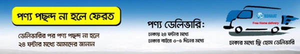 অনলাইন শপিং এ ক্রেতাদের আরো আগ্রহী করে তুলতে BDhaat.com ক্রতাদের দিচ্ছে ফ্রী হোম ডেলিভারি। আপনার পছন্দের পন্য ক্রয় করলে ২৪ ঘন্টার মধ্যে পৌঁছে যাবে আপনার নির্ধারিত ঠিকানায়। দিতে হবে না কোন এক্সট্রা চার্জ। এছাড়া ডেলিভারি পাওয়ার পর পন্য পছন্দ না হলে রয়েছে ফেরত এর ব্যবস্থা।