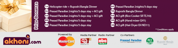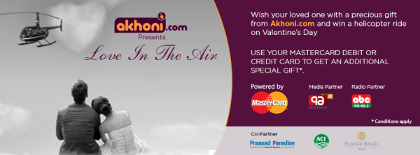 এই ভ্যালেন্টাইন দিবসে দেশের প্রথম সারির অনলাইন কেনাকাটার ই-কমার্স সাইট এখনই ডট কম akhoni.com আয়োজন করেছে এক অভিনব প্রতিযোগিতার। এ প্রতিযোগিতার বিজয়ী পাবেন তার প্রিয় মানুষটির সাথে হেলিকপ্টারে উড়ে বেড়াতে, পাঁচ তারকা হোটেল রুপসী বাংলায় ডিনার করতে এবং আরও অনেক অনেক পুরষ্কার।