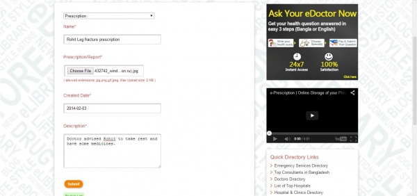 এবার ড্রপডাউন থেকে Prescription select করে নিচে নাম, প্রেসক্রিপশন এর তারিখ, মনে রাখার জন্য কোন ডেসক্রিপশন ইত্যাদি লিখে Submit এ ক্লিক করে সেভ করে ফেলুন আপনার প্রেসক্রিপশন।