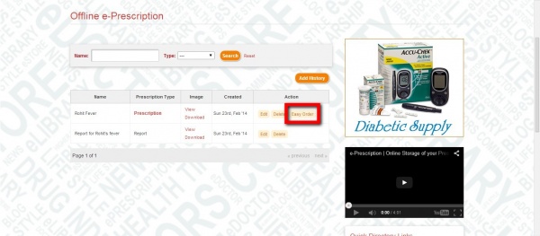 ই-প্রেসক্রিপশন পেজ এ আপনার সেভ করা ফাইল গুলো দেখতে পারবেন। এবং Easy Order বাটন এ ক্লিক করে সহজেই প্রেসক্রিপশন এর ঔষধ গুলো অর্ডার করতে পারবেন।
