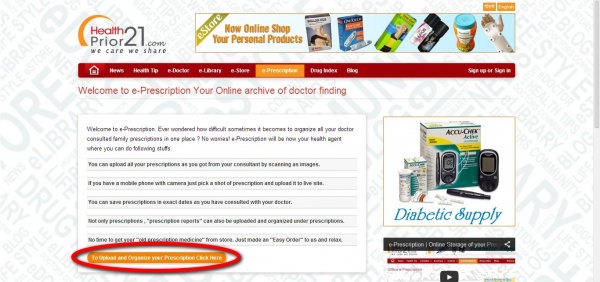 প্রথমে ই-প্রেসক্রিপশন এর লিঙ্ক এ যান। নিচের মত একটি পেজ আসবে। এখানে "To Upload and Organize your Prescription Click Here" বাটন এ ক্লিক করুন।