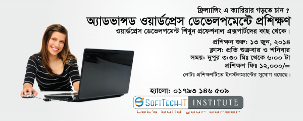 আমাদের অ্যাডভান্সড ওয়ার্ডপ্রেস ডেভেলপমেন্ট ব্যাচটির ক্লাশ শুরু হবে ১৩ জুন, ২০১৪ থেকে। ক্লাশ হবে সপ্তাহে দুদিন প্রতি শুক্রবার এবং শনিবার দুপুর ৩:৩০ থেকে ৬:০০ পর্যন্ত। দু মাসের তাত্ত্বিক প্রশিক্ষণ এবং এক মাসের রিয়েল লাইফ (৩ মাস+এক মাসের ইন্টারনি প্রজেক্ট = ৪ মাস) প্রজেক্ট সহ