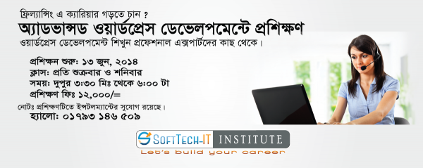সফটটেক-আইটি ইন্সটিটিউট আয়োজন করেছে ৩ মাসব্যাপী অ্যাডভান্সড ওয়ার্ডপ্রেস ডেভেলপমেন্ট প্রশিক্ষন। তিন মাসব্যাপী এ প্রশিক্ষণটিতে এসইচটিএমএল , সিএসএস, এসইচটিএমএল ৫, সিএসএস ৩, জাভাস্ক্রিপ্ট, জেকিউয়ারি, পিএসডি টু এসইচটিএমএল ৫- সিএসএস ৩ , প্রফেশনাল পি এইছ পি, ওয়ার্ডপ্রেস থিম ডেভেলপমেন্ট, ওয়ার্ডপ্রেস থিম কাস্টমাইজেশন, ওয়ার্ডপ্রেস প্লাগিন ডেভেলপমেন্ট, ওডেস্ক , ইল্যান্স , ফিবার , পিপল পার আওয়ার, বিডিং টেকনিক। এছাড়াও প্রত্যেকটি বিষয়ে প্রফেশনাল সেক্টরে দক্ষ হাতে কলমে শেখানো সহ পূর্ণ ওয়ার্ডপ্রেস ডেভেলপমেন্ট শেখানো হবে। ফ্রীল্যান্সিং এ ক্যারিয়ার গড়তে রিয়েল প্রফেশনাল ওয়ার্ডপ্রেস ডেভেলপারদের কাছ থেকে শিখুন এবং নিজেকে আন্তর্জাতিক মানেরওয়ার্ডপ্রেস ডেভেলপার হিসেবে নিশ্চিত করুন।