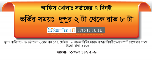 (হাউস বিল্ডিং মাস্কট প্লাজার অপজিট-এ ফাল্গুনী রেস্তোরার সাথে) উত্তরা, ঢাকা - ১২৩০ , ইমেইলঃ [email protected] , পেইজঃ https://www.facebook.com/softtechitinstitute , ফেসবুক গ্রুপঃ https://www.facebook.com/groups/softtechit/