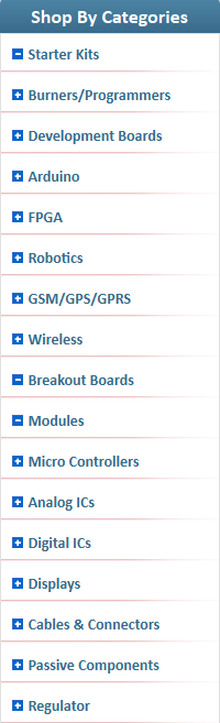 যেমনঃ Starter Kits, Burners/Programmers, Development boards, FPGA boards, Robotics, GSM/GPS/GPRS, Arduino, Raspberry Pi, Breakout Boards, Modules, Microcontrollers, Digital and Analog ICs, Displays, Cables and connectors, Tools & Components, Regulators, Switching Devices, Sensors, Audio components.