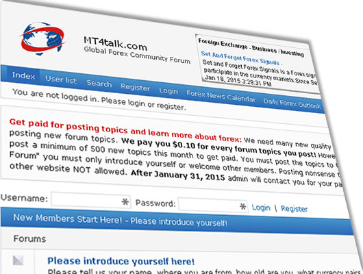 এটা খুবি সহজ একটা পদ্দতি আমি গতমাসে এটা থেকে ৫০ ডলার আয় করেছি তারা আমাকে পে করেছে আপনাদেরকেও করবে। শুরু করার জন্য প্রথমে registration করুন এবং পোস্ট করে শুরু করুন আর মনে রাখবেন সবাই ফরেক্স রিলেটেড টপিক্স পোস্ট করবেন। ফরেক্স রিলেটেড টপিক্স পোস্ট করার জন্য আপনারা বিভিন্ন ফরেক্স রিলেটেড ফরামের সাহায্য নিতে পারেন। এটা খুবি সহজ কাজ। নিচের লিঙ্কটা visit করুন তাহলে বুজতে পারবেন সব। Mt4talk.com