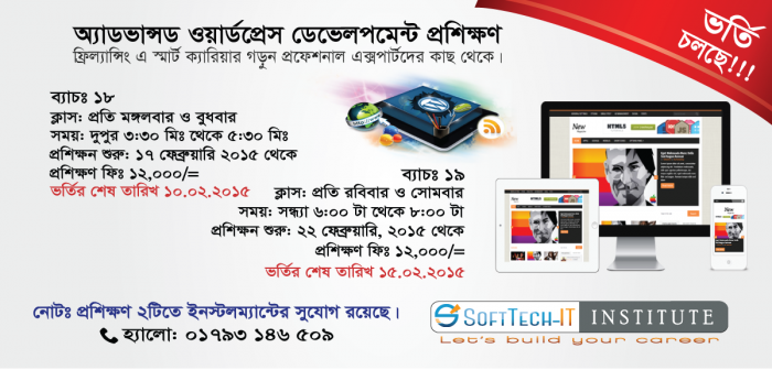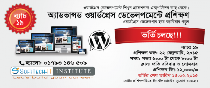 আমাদের অ্যাডভান্সড ওয়ার্ডপ্রেস ডেভেলপমেন্ট ব্যাচঃ ১৮- এর ক্লাশ শুরু হবে ১৭ ফেব্রুয়ারি, ২০১৪ থেকে। ক্লাশ হবে সপ্তাহে দুদিন প্রতি মঙ্গলবার এবং বুধবার দুপুর ৩.৩০ মিঃ থেকে ৫.৩০ মিঃ পর্যন্ত। দু মাসের তাত্ত্বিক প্রশিক্ষণ এবং এক মাসের রিয়েল লাইফ (৩ মাস+এক মাসের ইন্টারনি প্রজেক্ট = ৪ মাস) প্রজেক্ট সহ মোট প্রশিক্ষন ফি: ১২,০০০ টাকা।
