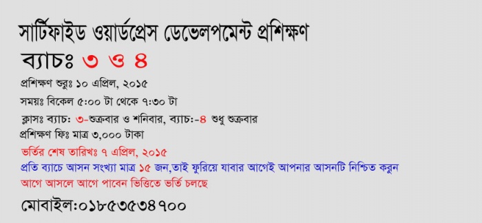 আমরা অত্যন্ত আনন্দের সাথে জানাচ্ছি যে,সকলের আন্তরিক সহযোগিতায় ক্যারিয়ার ফাউন্ডেশনের উদ্যোগে আগামী ১০ এপ্রিল,২০১৫ সার্টিফাইড অ্যাডভান্সড ওয়ার্ডপ্রেস ডেভেলপমেন্ট প্রশিক্ষণের ৩য় ও ৪র্থ ব্যাচের ক্লাস শুরু হচ্ছে।