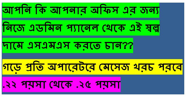 আপনি পাচ্ছেন অতি অল্প দামে বাল্ক এসএমএস যা আপনার বিজনেস এর প্রচার এর জন্য একটি আদর্শ মাইল ফলক। প্রচারেই প্রসার এই সত্য কে সামনে রেখেই শুরু হোক আপনার বিজনেস এর পথ চলা। এই বাল্ক এসএমএস সুদু মাত্র বিজনেস এর প্রচার অথবা আপনার প্রিয়জন কে ওয়িশ করার জন্য। আপনি ৫ টি মোবাইল অপারেটরই এই মেসেজ পাঠাতে পারবেন। আপনি আপনার প্রতিষ্ঠানের নাম দিয়েই এসএমএস করবেন। মেসেজ টি পাঠাতে পারবেন ২ টি অপশন এ