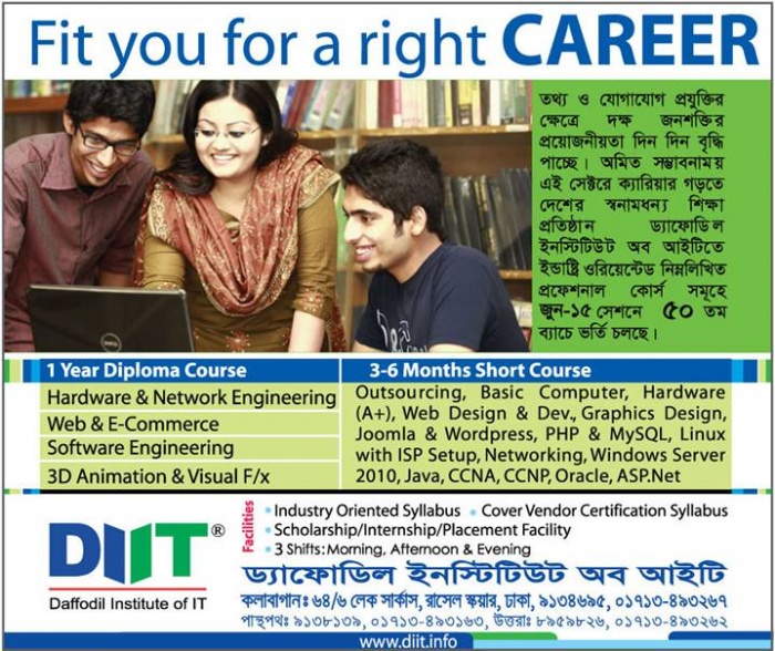 সময়ের সাথে সাথে দেশ যতই এগিয়ে যাচ্ছে দেশের আর্থসামাজিক উন্নয়ন ততই আইটি নির্ভর হয়ে পড়ছে। যার ফলে আইটি সেক্টর হয়ে উঠেছে ক্যারিয়ার ডেভেলপমেন্টের জন্য তরুন-প্রজন্মের প্রথম পছন্দ। আইটি সেক্টরের বিভিন্ন ধরনের বিশেষায়িত শাখা যেমনঃ হার্ডওয়্যার মেইনটেন্যান্স, নেটওয়ার্ক সার্টিফিকেশন, সিসিএনপি, উইন্ডোজ সার্ভার বার, সফ্টওয়্যার ইঞ্জিনিয়ারিং, ডেটাবেজ ম্যানেজমেন্ট, জুমলাওয়ার্ডপ্রেস, অবজেক্ট ওরিয়েন্টেড পিএইচপি, সিসিএনএ, লিনাক্স, ওয়েব ডিজাইন এন্ড ডেভলপমেন্ট, আউটসোর্সিং প্রভৃতি সেক্টরই স্বপ্নময় সম্ভাবনা সমৃদ্ধ, কিন্তু দরকার বিশেষায়িত দক্ষতা ও জ্ঞানের গভীরতা এবং বাস্তবমুখী শিক্ষার প্রায়োগিক ক্ষমতা। কিন্তু আমাদের দেশে বাস্তবমুখী শিক্ষা গ্রহনের জন্য পর্যাপ্ত সংখ্যক দক্ষ ও মানসম্মত শিক্ষা প্রতিষ্ঠানের অভাবই এক্ষেত্রে প্রধান অন্তরায় হয়ে দেখা দিয়েছে। এক্ষেত্রে ড্যাফোডিল ইনস্টিটিউট অব আইটি’র প্রয়াশকে ব্যতিক্রম বলা যেতে পারে। সাফল্যের সাথে শতশত শিক্ষার্থীকে প্রফেশনাল প্রশিক্ষণ প্রদান, আত্মকর্মসংস্থানে সহায়তা ও দেশের আর্থসামাজিক উন্নয়নে যুগান্তকারী ভূমিকা পালন করার জন্যই ডিআইআইটি আজ দেশের সেরা প্রশিক্ষণ প্রদানকারী প্রতিষ্ঠান হিসাবে প্রতিষ্ঠিত।