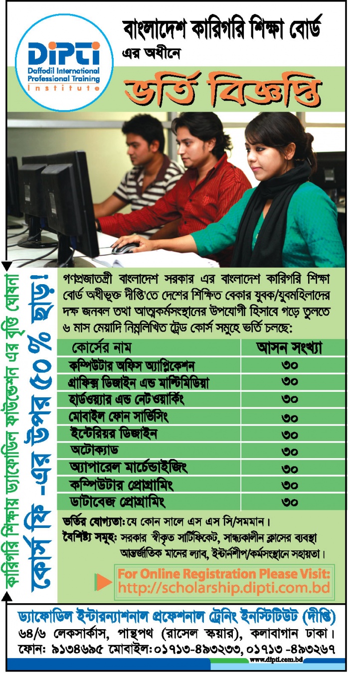 গনপ্রজাতন্ত্রী বাংলাদেশ সরকার-এর বাংলাদেশ কারিগরি শিক্ষা বোর্ড অধিভূক্ত দেশের শীর্ষস্থানীয় তথ্যপ্রযুক্তি ও প্রফেশনাল প্রশিক্ষণ প্রদানকারী প্রতিষ্ঠান ড্যাফোডিল ইন্টারন্যাশনাল প্রফেশনাল ট্রেনিং ইনস্টিটিউট (দীপ্তি) দেশের আর্থসামাজিক উন্নয়নের সাথে সম্পর্কিত বিভিন্ন সেক্টরের বিশেষায়িত বিষয়ের উপর ২০০৪ সাল থেকে প্রশিক্ষণ প্রদান করে আসছে। প্রফেশনাল প্রশিক্ষন প্রদানের মাধ্যমে দেশের শিক্ষিত বেকার যুবক/যুবমহিলাদের দক্ষ জনবল তথা আত্ম কর্মসংস্থানের উপযোগী হিসাবে গড়ে তুলতে বাংলাদেশ কারিগরি শিক্ষা বোর্ড অধীভূক্ত ৬ মাস মেয়াদী নিম্নলিখিত বেসিক ট্রেড কোর্স সমূহে জুলাই-ডিসেম্বর’১৫ সেশনে সরকার নির্ধারীত সীমিত সংখ্যক আসনে আগে আসলে আগে পাবেন ভিত্তিতে ছাত্র-ছাত্রী ভর্তি চলছে।