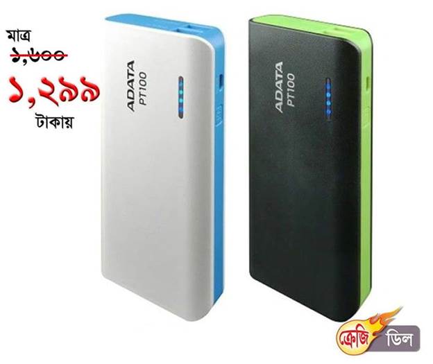 স্মার্ট ফোনটিকে আরো স্মার্ট করতে কিনুন প্রয়োজনীয় অনুষঙ্গ। এলো স্মার্ট ভিভাইসের ব্যাটারি সমস্যা সমাধানের জন্য স্মার্ট সল্যূশন! আকর্ষণীয় দামে ADATA PT100 ১০০০০ MAH পাওয়ার ব্যাঙ্ক পাচ্ছেন। দাম মাত্র ১,২৯৯ টাকা।