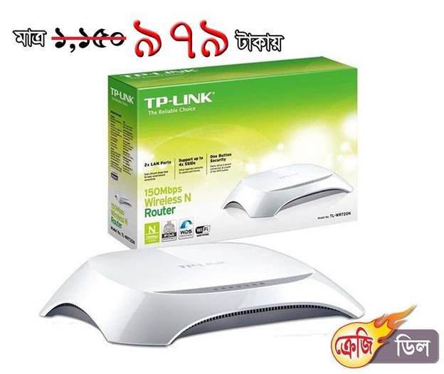 সাধ ও সাধ্যের মিল, পাশে আছে আজকেরডিলTP LINK WR720 ওয়্যারলেস রাউটার-150MBPS পাচ্ছেন মাত্র ৯৭৯ টাকায়। ওয়্যারলেস ট্রান্সমিশন রেট: 150Mbps। ইন্টারনেট সার্ফিং, ই-মেইল ও অনলাইন চ্যাটের জন্য অাদর্শ।